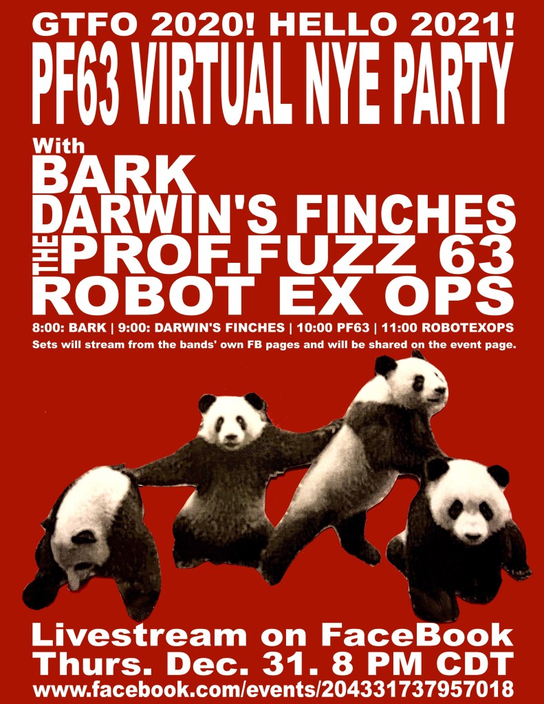 Kick 2020 out the door with The Prof.Fuzz 63 and friends BARK (Knoxville), Darwin’s Finches (Houston), and the RobotExOps (Asheville). Sets will stream from the individual band FB pages and be shared to the event page: https://www.facebook.com/events/204331737957018