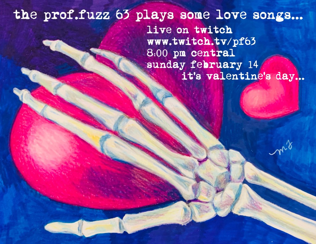 So, you when you think of songs by The Prof.Fuzz 63, you probably think of inane ditties about pandas and owls, and (correctly) assume The Prof doesn’t have a romantic bone in his body. We’re going to try to dispel that popular notion on Valentine’s Day with a short pop-up set of six classic PF63 songs about peaches and cantaloupes, crushes on healthcare workers, honeymoons and wedded bliss, and sweet dreams.