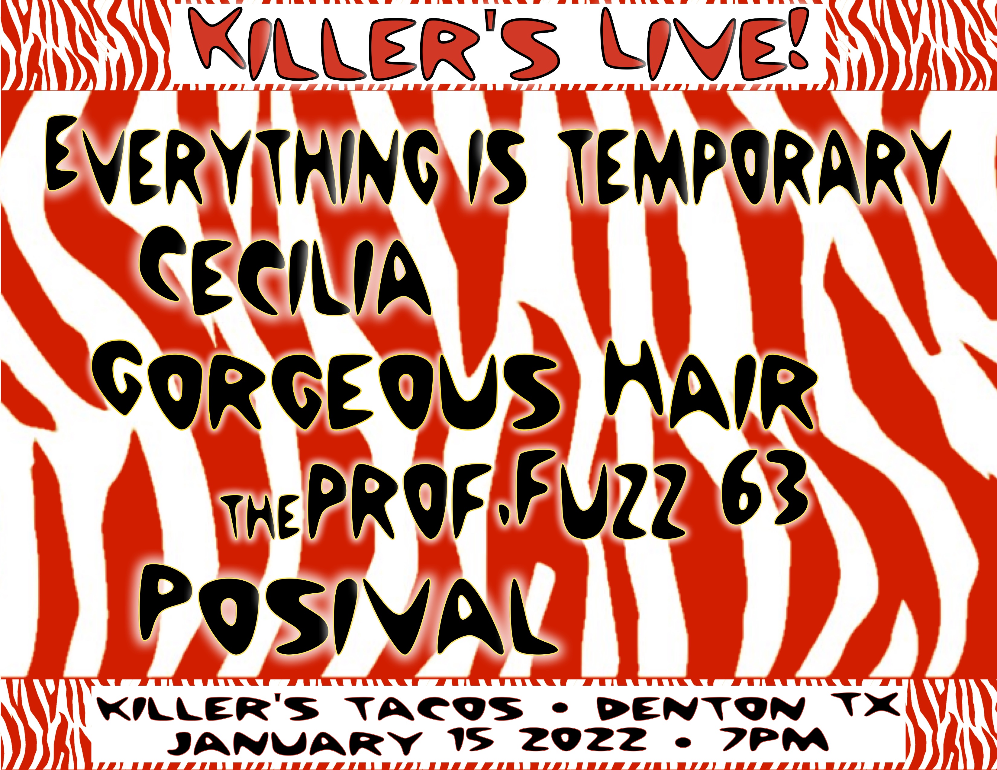 Saturday night live in Denton! We’ll be joining Posival, Gorgeous Hair, Ceclia, and Everything is Temporary for an evening of tacos, beer, and music at Killer’s. Music starts at 7 PM. Bring your vax card. Mask up. Rock out.