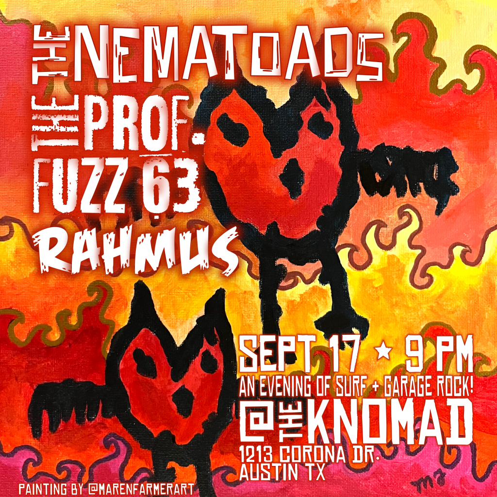 Saturday Sept 17 in Austin at The Knomad with Rahums, and The Nematoads! https://www.facebook.com/events/623011169408683