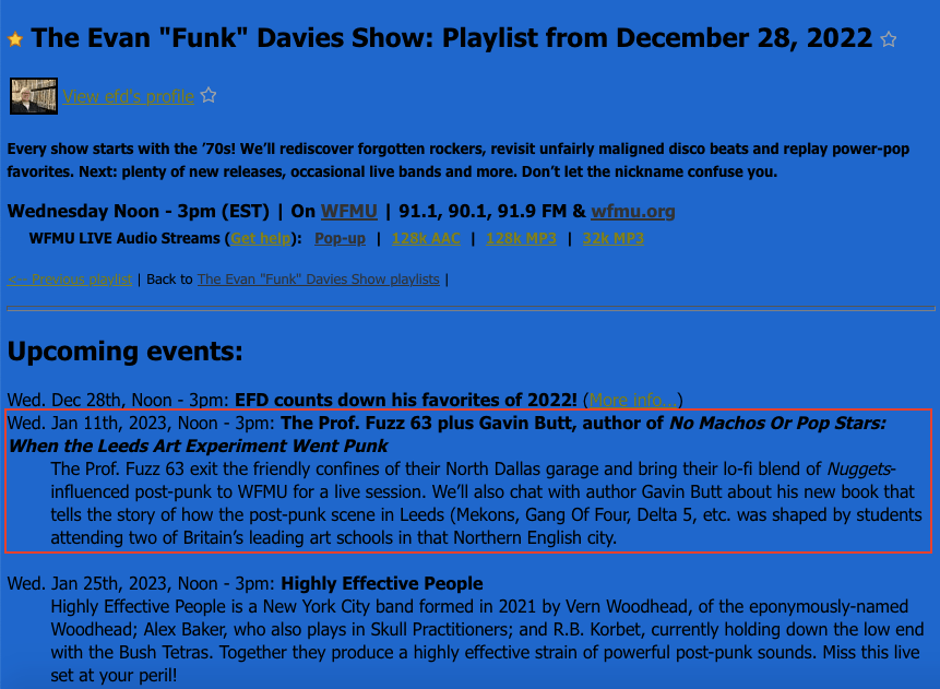 We’re gonna be doing a (pre-recorded) live session on The Evan Funk Davies Show on WFMU (11:00 AM-2:00 PM Central) on Wednesday, 11 January 2023!