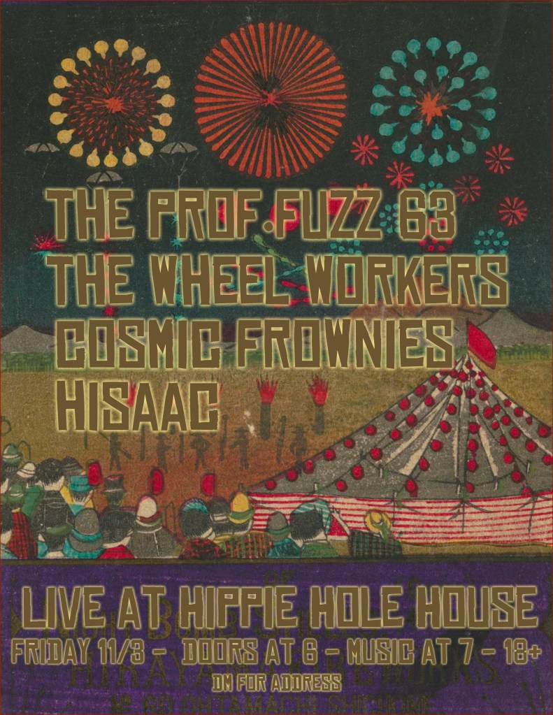 Friday November 3rd we’re back at the Hippie Hole House in Denton for a garage-rockin’ house party! Joined by our friends Hisaac, Cosmic Frownies, and The Wheel Workers (Houston), it’s gonna be a classic Denton evening.