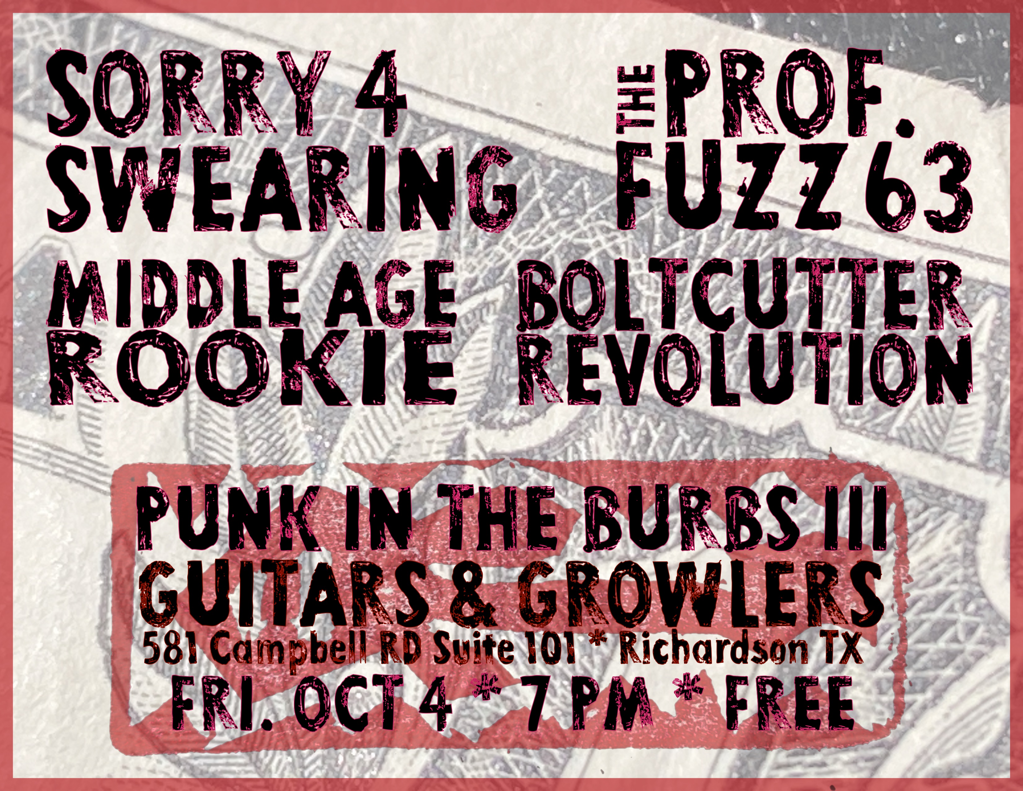 Friday Oct 4 we return to Guitars & Growlers in Richardson for round 3 of the “Punk in the Burbs” show series. We’ll be joined by Sorry 4 Swearing, Middle Age Rookie, and Boltcutter Revolution. The show starts early (music at 7 PM) and is FREE. Enjoy some beverages and grub from the G&G crew, and some punk and punk-adjacent rock.
