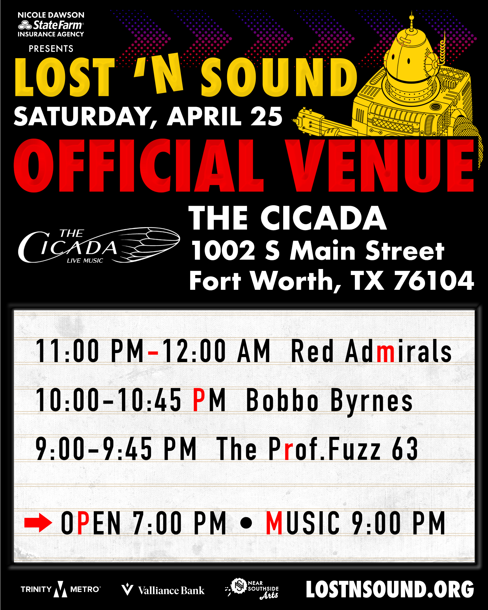 thanks to lost ’n sound and sponsors Nicole Dawson – State Farm Insurance Agent, with support from Valliance Bank and Trinity Metro!