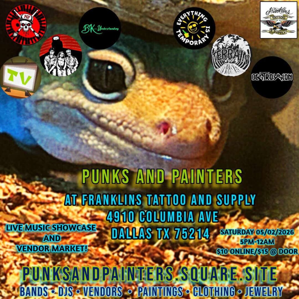 next up: another punks & painters wingding! saturday. may 2nd. this one’s at franklin’s tattoo in dallas. event starts at 5 PM. we play at 7 PM. music goes on until late!