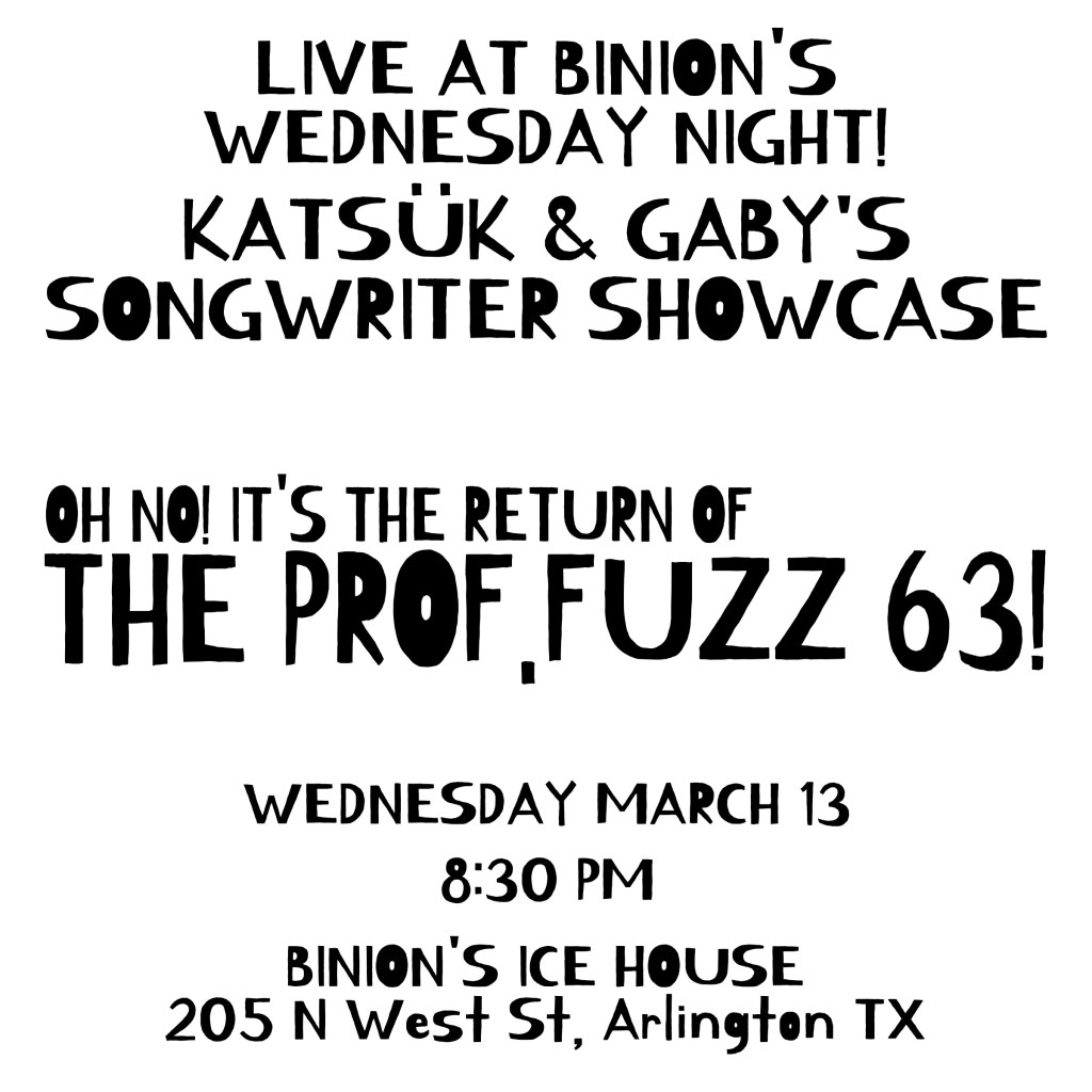 Wednesday March 13 we’re the returning-guests on a Live at Binion’s Songwriter’s Showcase session at Binion’s Ice House in Arlington. The festivities start at 8:30, and we’ll be performing some songs from the depths of the PF63 catalog (old songs night!)! No overlap from the set we played there in November. Open to the public. Come get sung to!