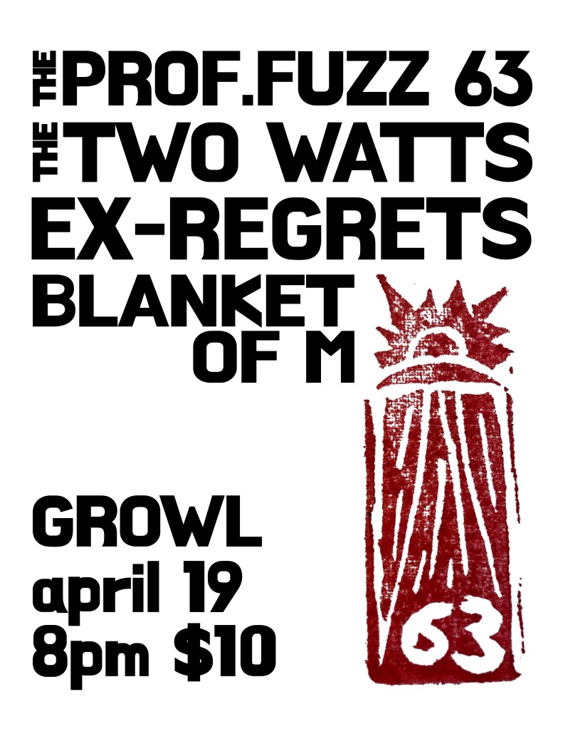 Blanket of M kick things off at 8, followed by Ex-Regrets, and The Two Watts. It’s gonna be a fun time, so come out early, grab some pizza or a burger and some beer, and rock out!
