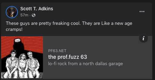 “You can’t know just how great The Prof.Fuzz 63 is without witnessing them live. I discovered their Bandcamp last year when I was searching for bands to play with in OKC – only to end up very surprised when I found out they were Dallas locals. We ended up recorded a song together for my Matchstick Singles. I had to – their music rocks. Catchy, ironic, hilarious Velvet Underground-meets-Ramones-meets-all-the-best-organ-centric-bands-from-the Doors-to-the Sir Douglas Quintet-and-the Horrors.” — Nathan Mongol Wells, Facebook (January 31, 2019)