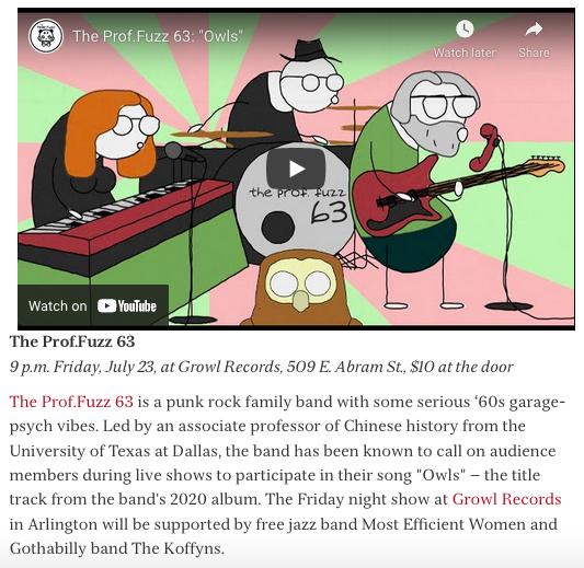 “I’d met Professor Fuzz, who’s a no-fooling history prof and Sinologist at UT Dallas, at a show a couple of years ago, and had dug his band’s quirkily idiosyncratic garage rock online, but this was my first chance to hear them in person.