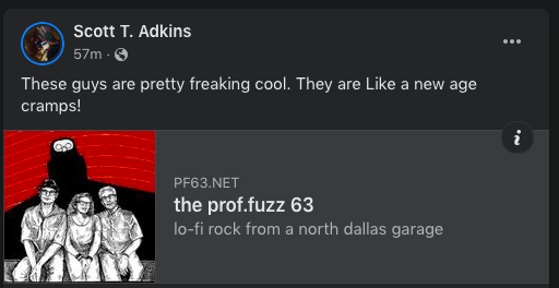 “You can’t know just how great The Prof.Fuzz 63 is without witnessing them live. I discovered their Bandcamp last year when I was searching for bands to play with in OKC – only to end up very surprised when I found out they were Dallas locals. We ended up recorded a song together for my Matchstick Singles. I had to – their music rocks. Catchy, ironic, hilarious Velvet Underground-meets-Ramones-meets-all-the-best-organ-centric-bands-from-the Doors-to-the Sir Douglas Quintet-and-the Horrors.” — Nathan Mongol Wells, Facebook (January 31, 2019)